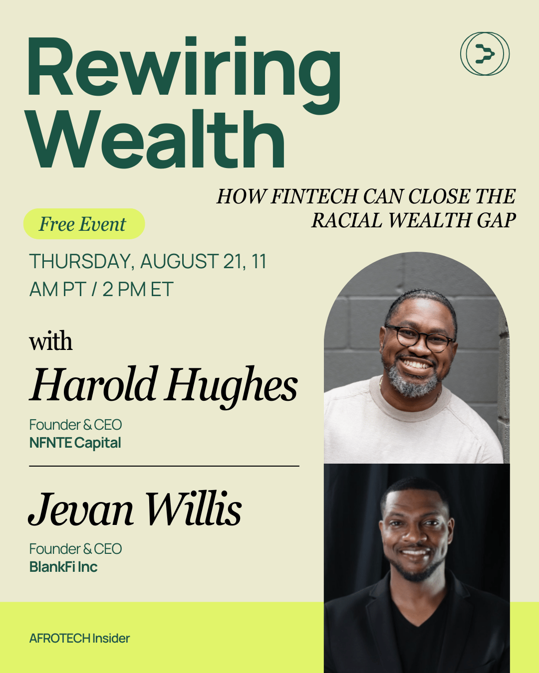 BlankFi’s Founder & CEO Jevan Willis was a guest panelist on the AFROTECH Insider’s panel discussing how to close the racial wealth gap and unlocking equity using Fintech pathways to capital and generational wealth.